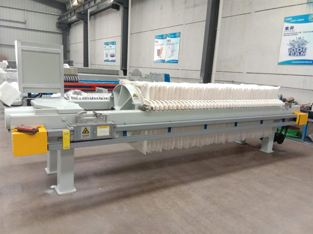 廂式壓濾機在輸料泵的壓力作用下,將過濾物輸送到各濾室內,通過過濾介質將固體和液體分離。廂式壓濾機濾室有一塊平板濾板和一塊中空的濾框組成,濾布固定在板框上的,這是早期主要壓濾機形式,而廂式壓濾機的濾室是由相鄰兩塊凹陷的濾板構成,主要優點是_換濾布方便,缺點是效率低、過濾效果不好、濾板容易壞。在濾布上形成濾渣,慢慢積累形成濾餅。濾液穿過濾布并沿濾板溝槽流至下方出液孔通道,集中排出。過濾完畢,可通入清洗滌水洗滌濾渣。洗滌后,有時還通入壓縮空氣,除去剩余的洗滌液。過濾結束后打開壓濾機卸除濾餅,清洗濾布,重新壓緊板濾開始下一工作循環。